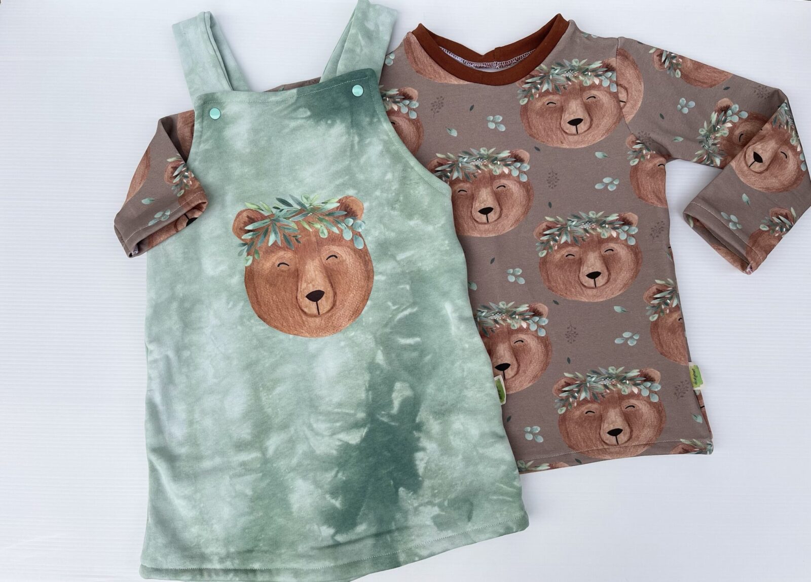 Entzückendes Latzkleid aus Sweatstoff mit Boho Bärchen und dazu passendem Langarm Shirt