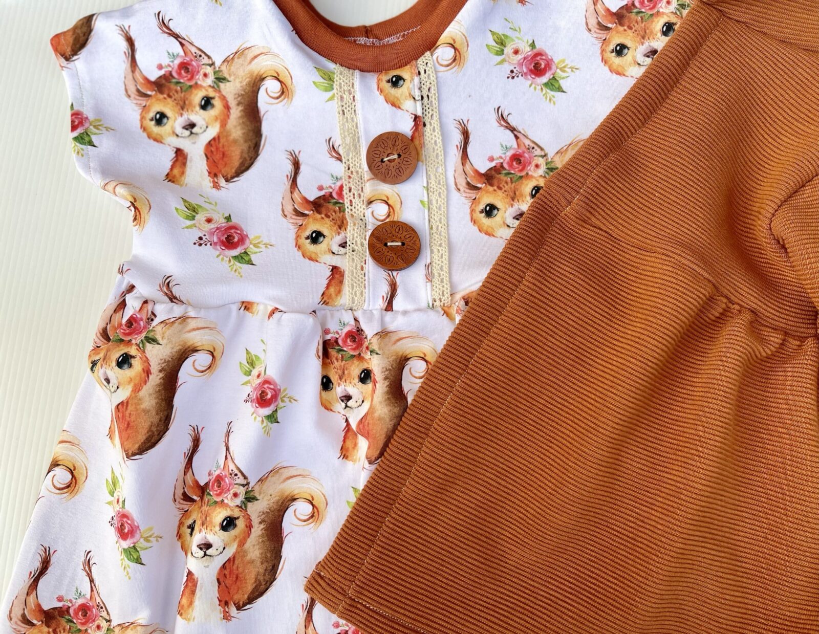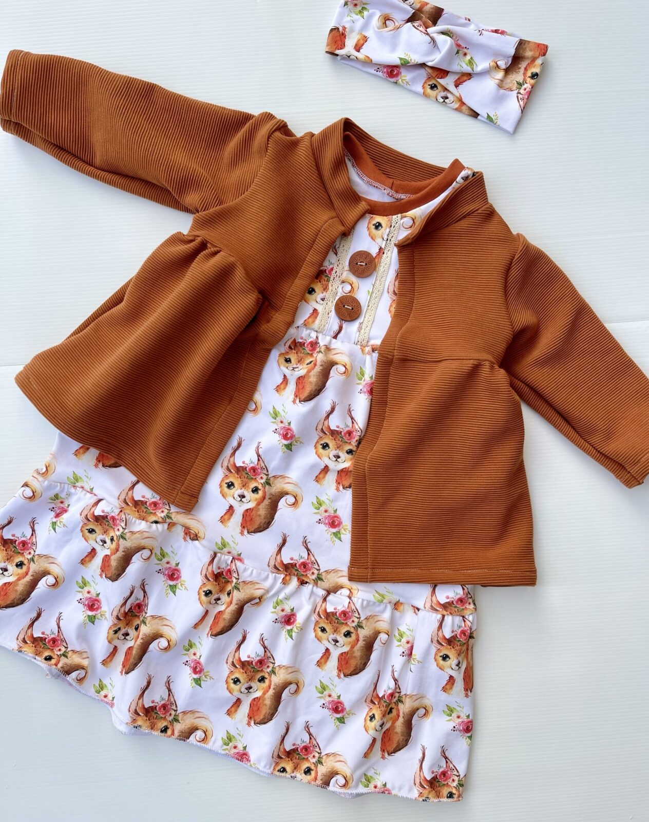 verspieltem Stufenkleid mit dazugehörigem Knotenhaarband aus Baumwolljersey und einem passenden Jäckchen aus Ribjersey