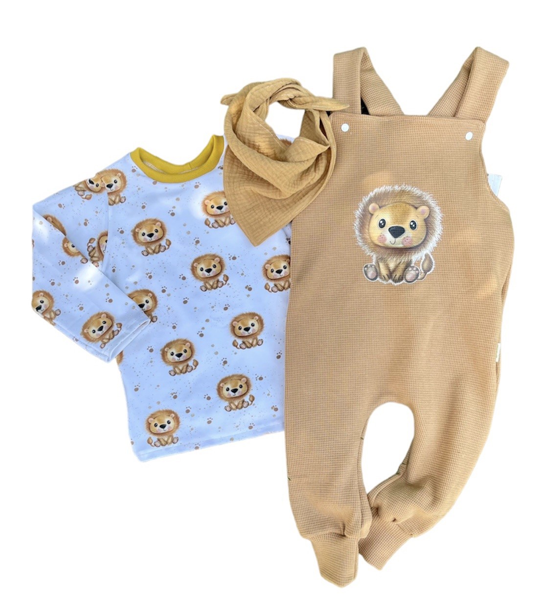 Lässige Latzhose aus Jeansjersey mit und dazu passendem Langarm Shirt mit Musselin Halstuch