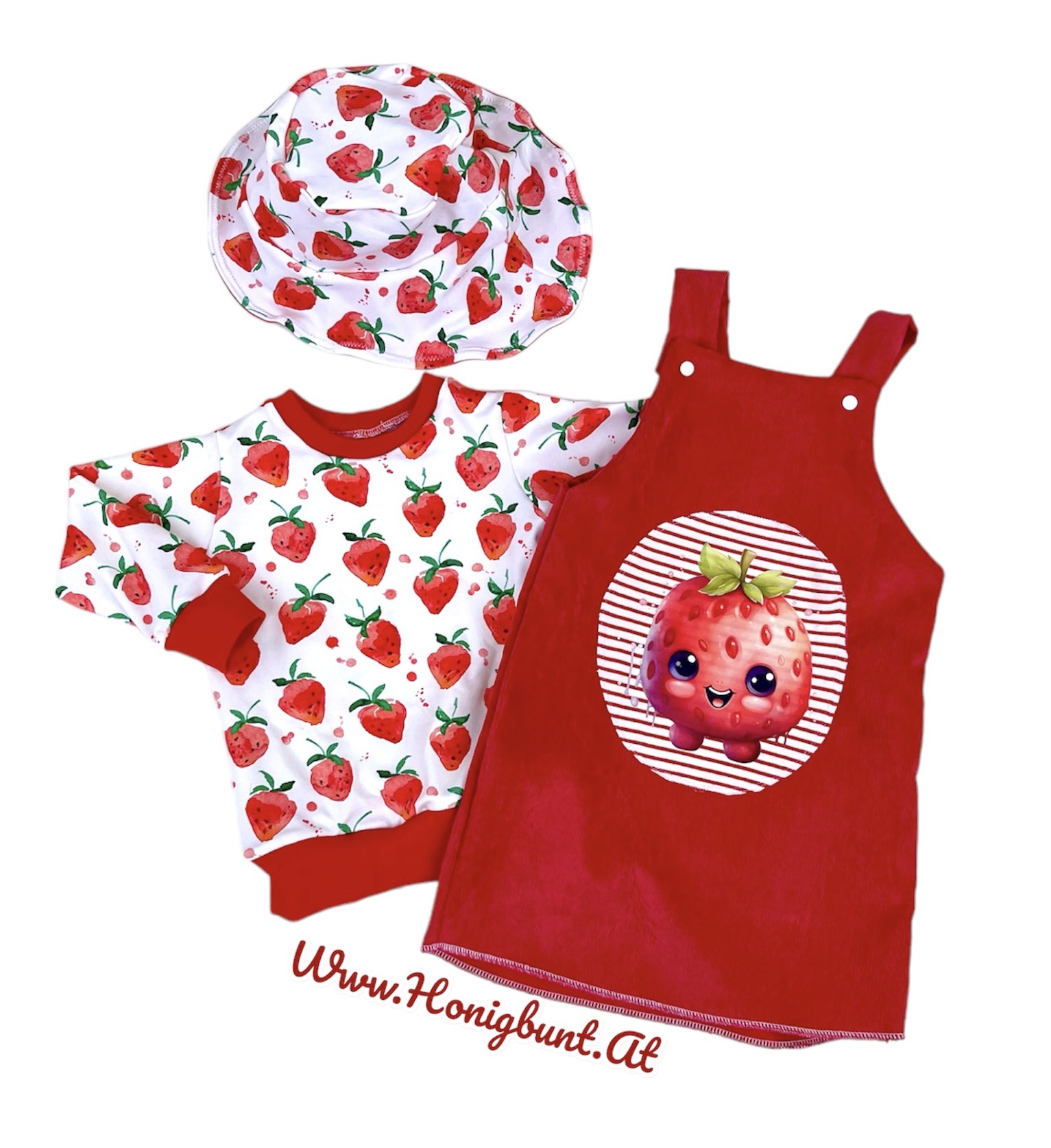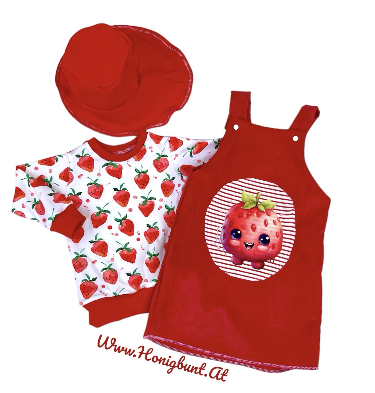 Fröhlich freches Set, bestehend aus einem Langarm Shirt und einem farbenfrohem Latzkleid aus dünnem Cord-Stoff, so wie einer tollen Sommermütze zum Wenden.