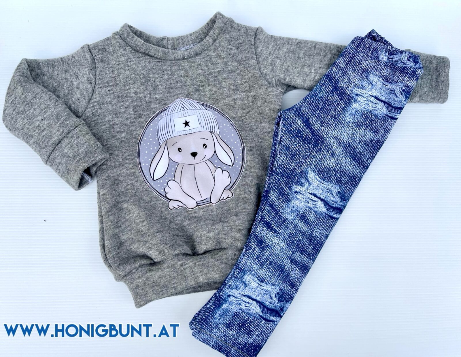 Kuscheliger Pullover mit Hasen Applikation und dazu passender Leggings aus Jeansjersey