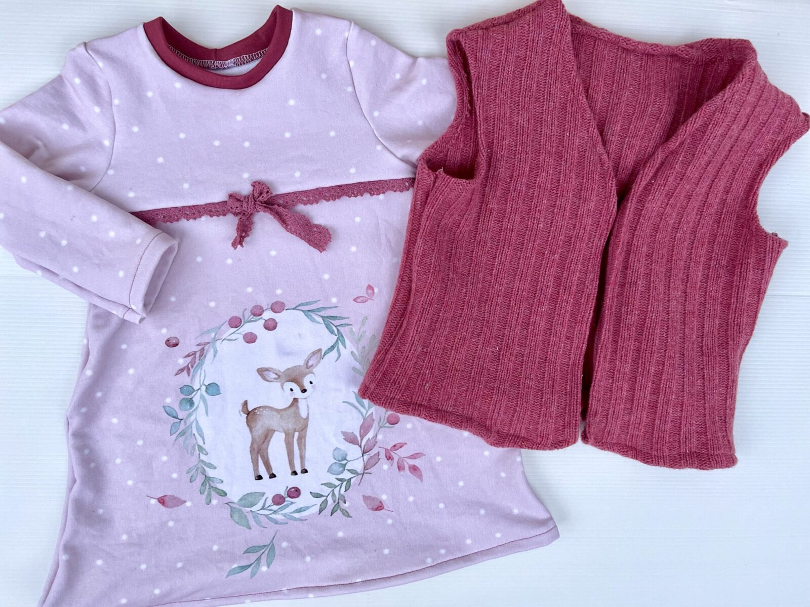 Romantisches Set bestehend aus langärmeligem Sweat-Kleid und kuscheliger Weste aus Strick