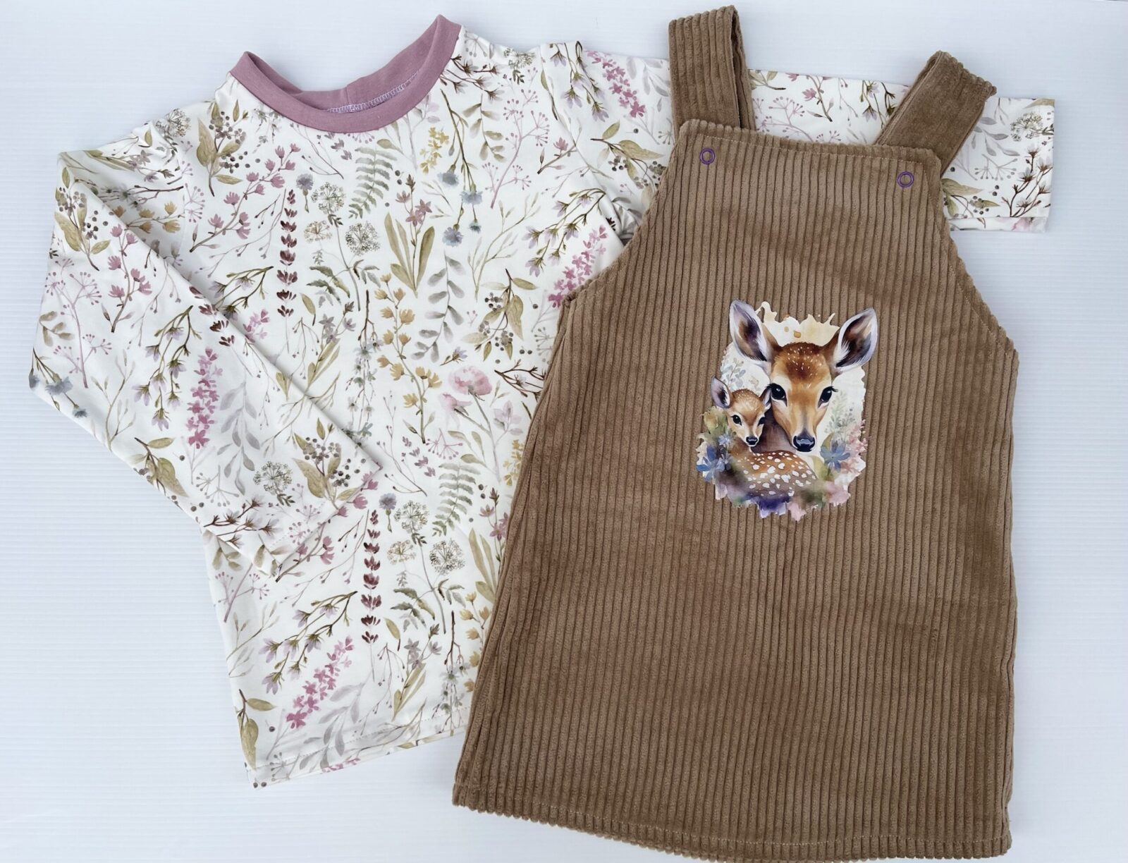 Entzückendes Latzkleid aus Cordstoff mit Reh und dazu passendem Langarm Shirt aus Baumwolljersey