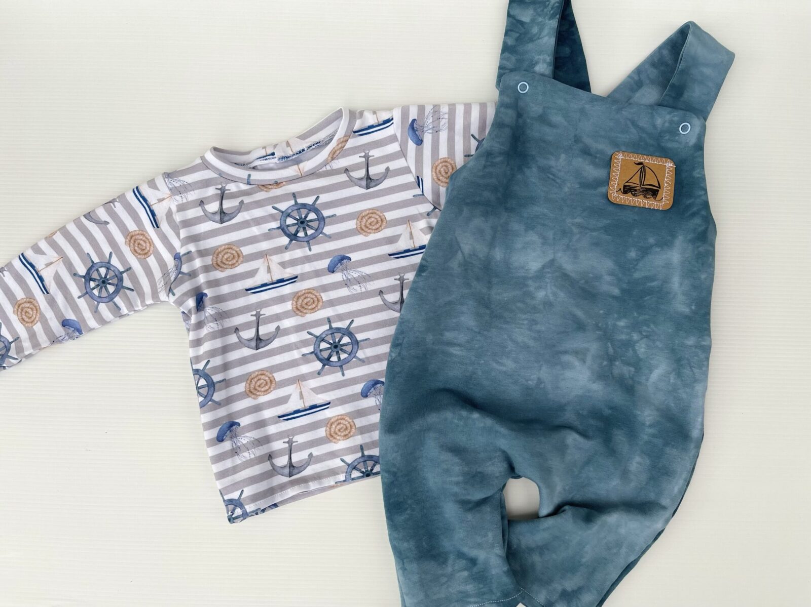 Maritimes Set bestehend aus Latzhose aus Sweatstoff und Langarm Shirt aus Baumwolljersey