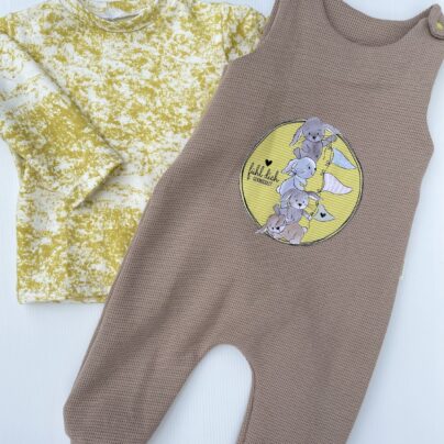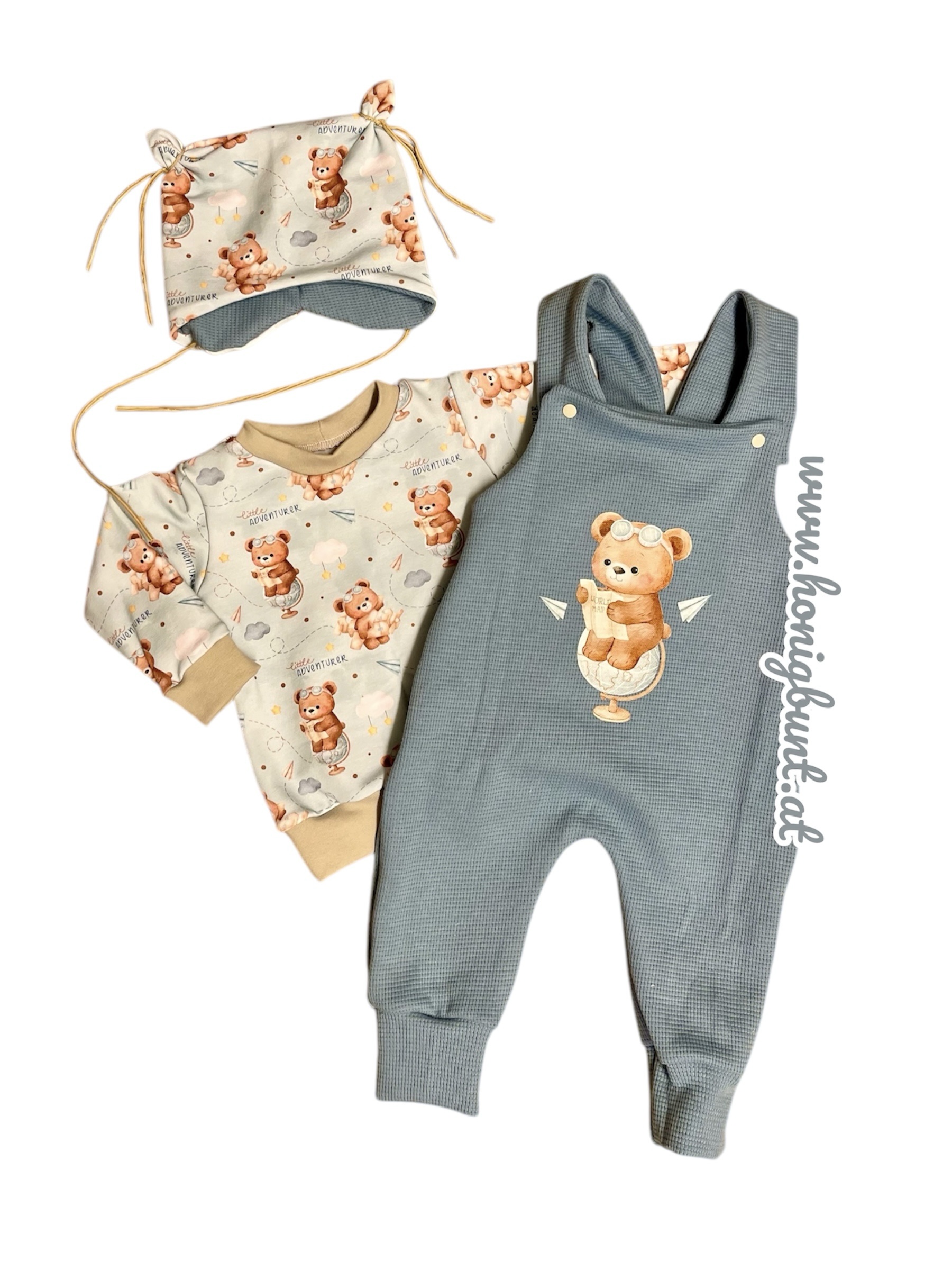Entzückendes, 3tlg Set, bestehend aus einem Pullover und einer Latzhose sowie einem süßen Knotenmützchen,