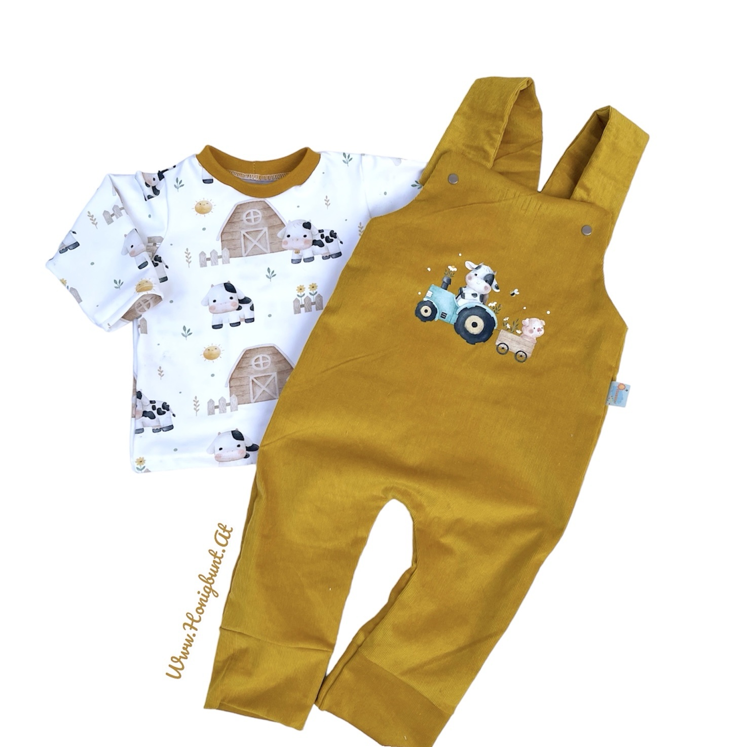Latzhose aus Cordstoff sowie ein Langarm T-Shirt aus dünnem Baumwoll Jersey