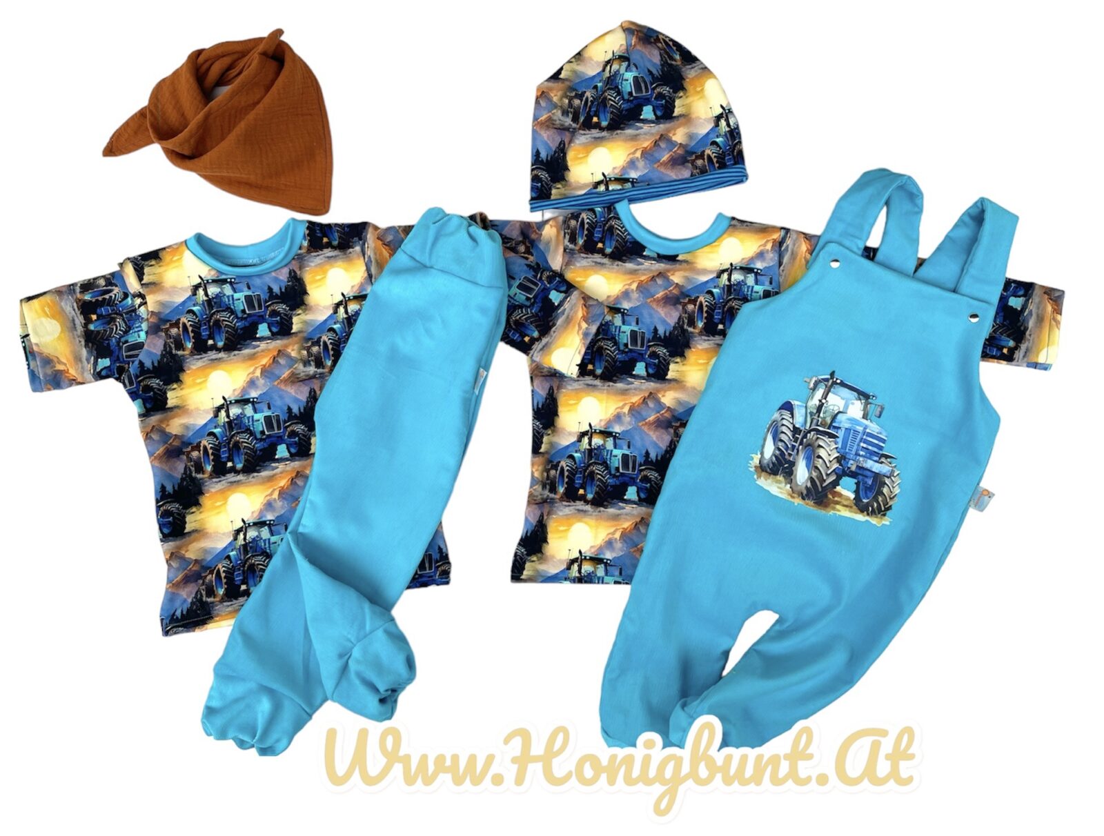 Dazu gehört eine poppige Latzhose mit Traktorbild, ein ultra cooles Traktoren Langarm Shirt und eine dünn gefütterte Mütze.