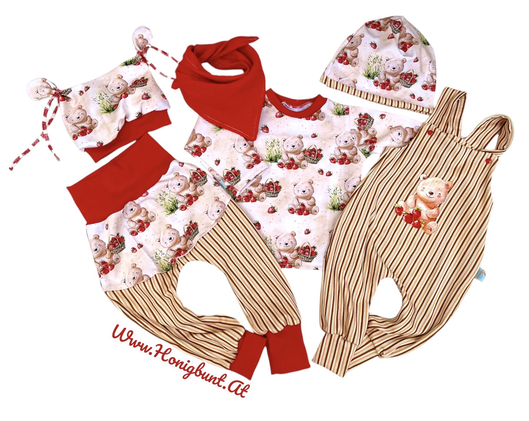 Latzhose aus Ribjersey, Materialmix Pumphose mit poppiger Teilung und mitwachsenden Bündchen, einem Langarm Shirt sowie einer zweilagigen Mütze, einem Knotenmützchen und einem Musselintuch zum Binden