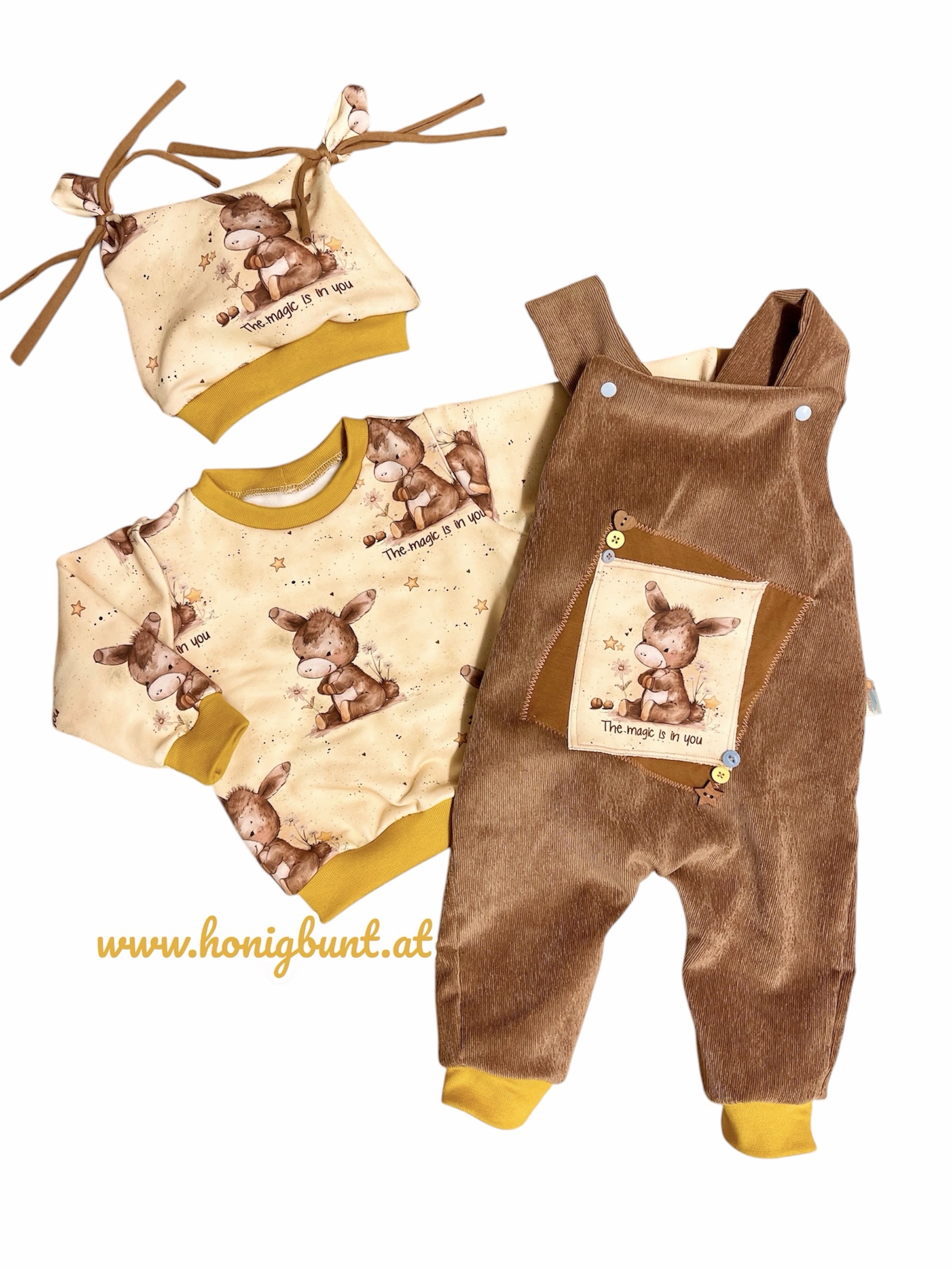 Zauberhaftes, 3tlg Set, bestehend aus einem Pullover, Pumphose, einer Latzhose sowie einem süßen Knotenmützchen,