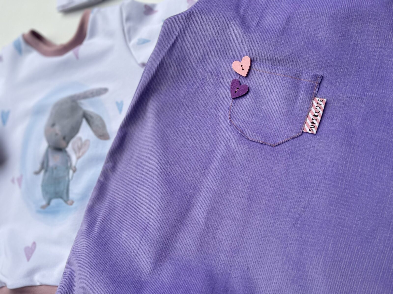 einer poppige Latzhose mit Brusttasche, einem Pullover und einer gefütterten Mütze