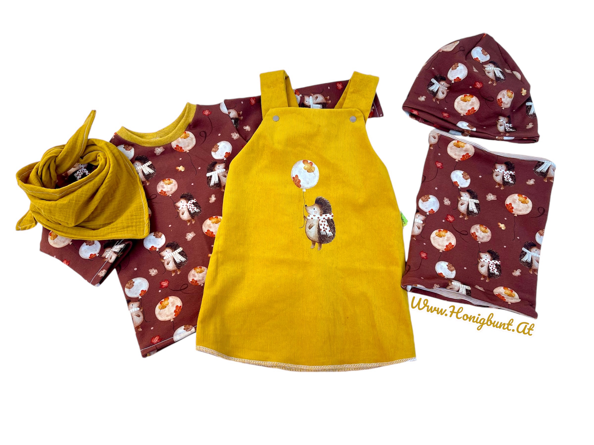 Latzkleid aus Cord-Stoff mit passendem Langarm Shirt und dazugehörigem Set, bestehend aus Mütze und Loop, sowie einem Halstuch aus Musselin zum Binden